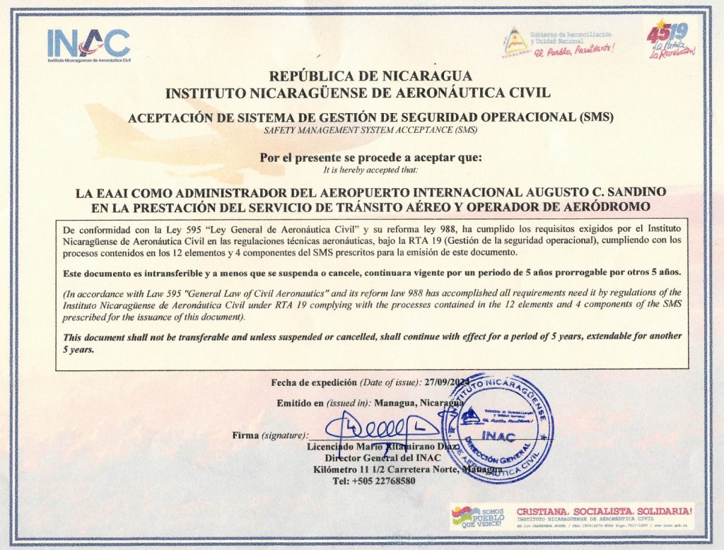 El Instituto Nicaragüense de Aeronáutica Civil (INAC), en cumplimiento de la Ley 595 “Ley General de Aeronáutica Civil” y su reforma, Ley 988, otorga a la Empresa Administradora de Aeropuertos Nacionales e Internacionales (EAAI) el Certificado de Aceptación del Sistema de Gestión de la Seguridad Operacional (SMS), como parte de la administración del Aeropuerto Internacional Augusto C. Sandino en la prestación de los Servicios de Tránsito Aéreo y en su función como operador de aeródromo.